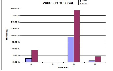 This bar graph compares the shift in probability of qualifying shift for a specific program (Civil Engineering – CE) for the students at different schools. The probability seems to have increased for Schools A, C, and D (School B is not even on the charts bearing a low probability for 2009 and 2010), while School C expectantly showing the highest increase as well as the highest among all schools.
