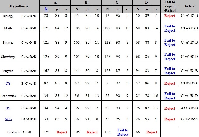 The statistical table from above shows that “School C” is mutually exclusive from all the three other schools for the aggregate scores of all subjects put together.